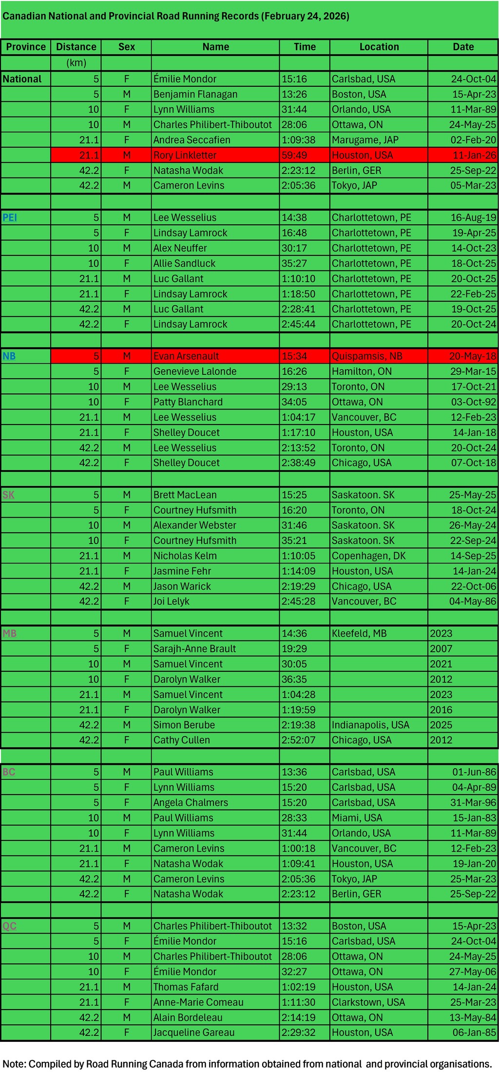 Compiled from World Athletics and Canadian Distance Running. Rankings only include certified courses.
